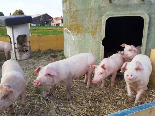 Schweinefleisch Unsere Schweine dürfen im Feld groß werden, mit Gras und Erde zum Wühlen, einer Suhle mit Wasser, einer Sonnenstore für Schatten und einem Stall, um Regen und Wind zu entkommen. Das Futter, neben Heu und Gras, kaufen wir von der Landi zu und es enthält keine medizinischen Zusatzstoffe. Die Jungschweine kaufen wir von einem Betrieb aus unserer Verwandtschaft zu.
